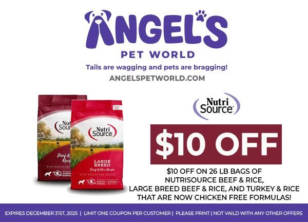 $10 OFF on 26 LB bags of NutriSource Beef & Rice, Large Breed Beef & Rice, and Turkey & Rice that are now Chicken Free Formulas!
