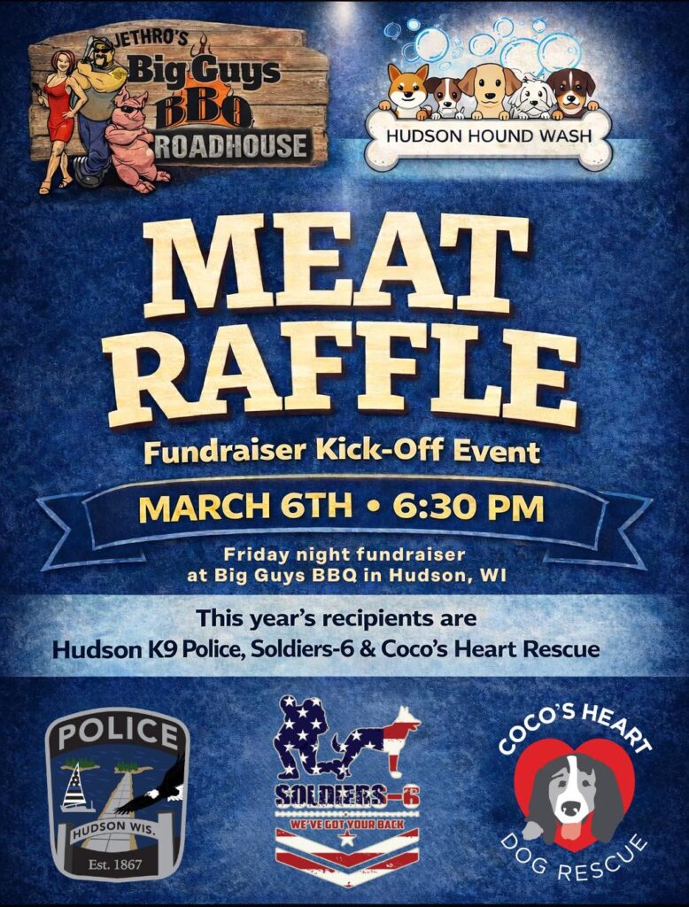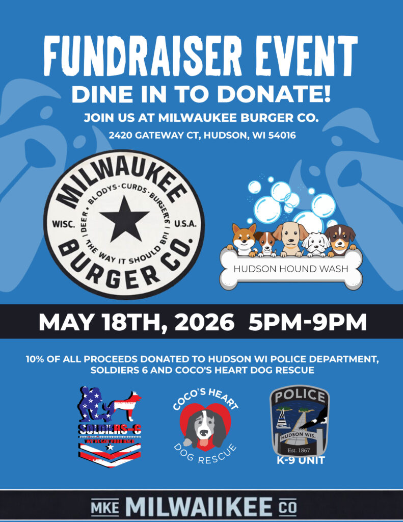 All Proceeds will go to Hudson WI Police Department, Soldiers 6 and Coco’s Heart Dog Rescue