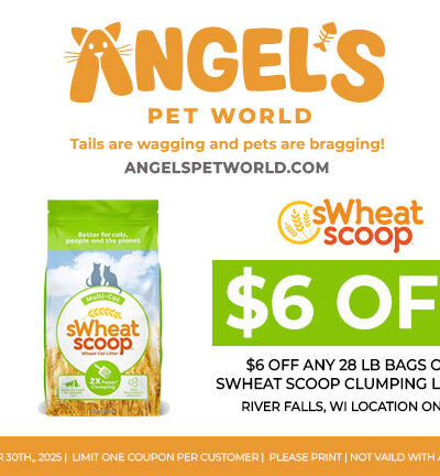 $3 Off Any Size Fresh News Cat Litter at Angel’s Pet World in Hudson, WI or River Falls, WI.